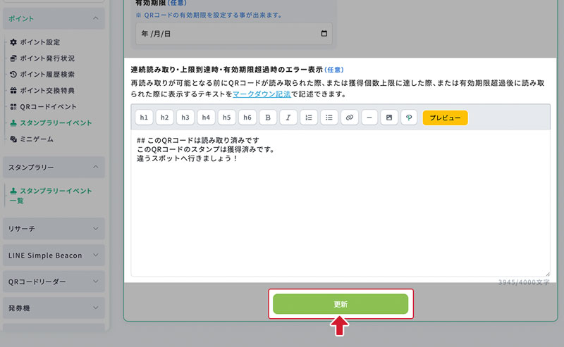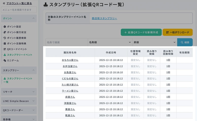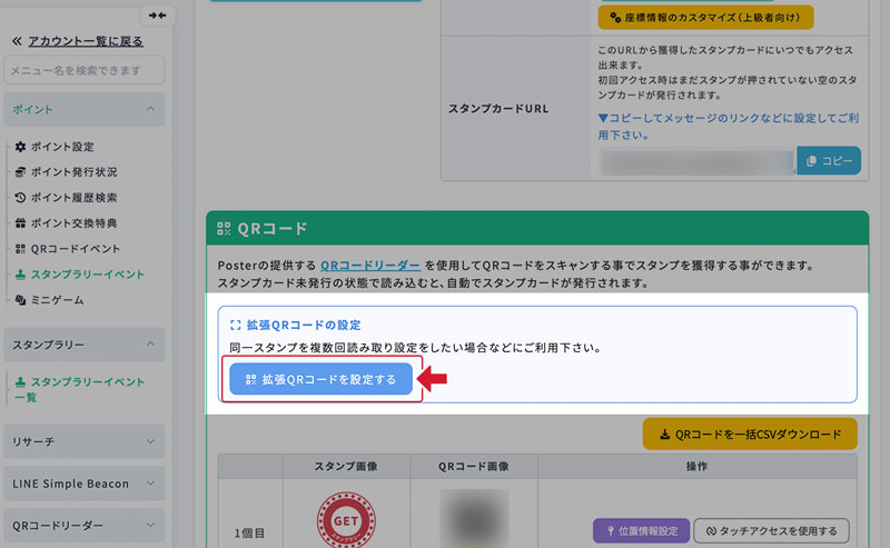 スタンプの数よりもQRコードを多く設置したい場合は、「拡張QRコード」を設定することで実現可能です。
