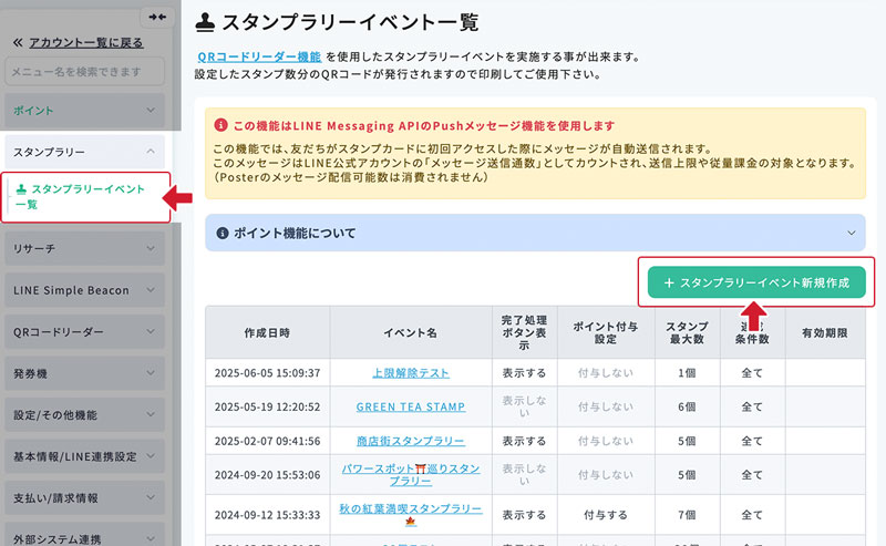 サイドメニューから「スタンプラリー」を開き「 スタンプラリーイベント一覧」を選択します。