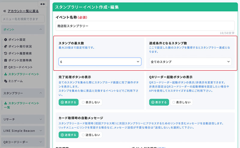「スタンプの最大数」は「6」で、「達成条件となるスタンプ数」も「全て」を選択します。