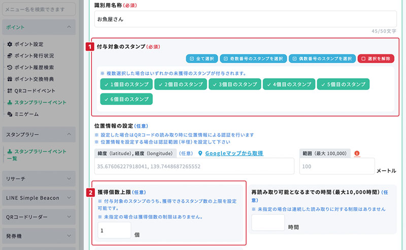 この例では、スタンプカードに表示するスタンプの数は6つで、QRコードは10箇所に設置したいと思います。