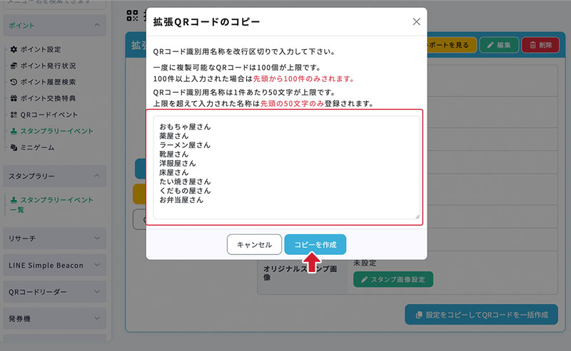 詳細画面の右下にある設定をコピーしてQRコードを一括作成ボタンをクリックします。