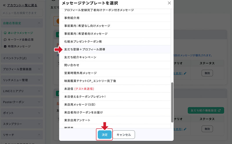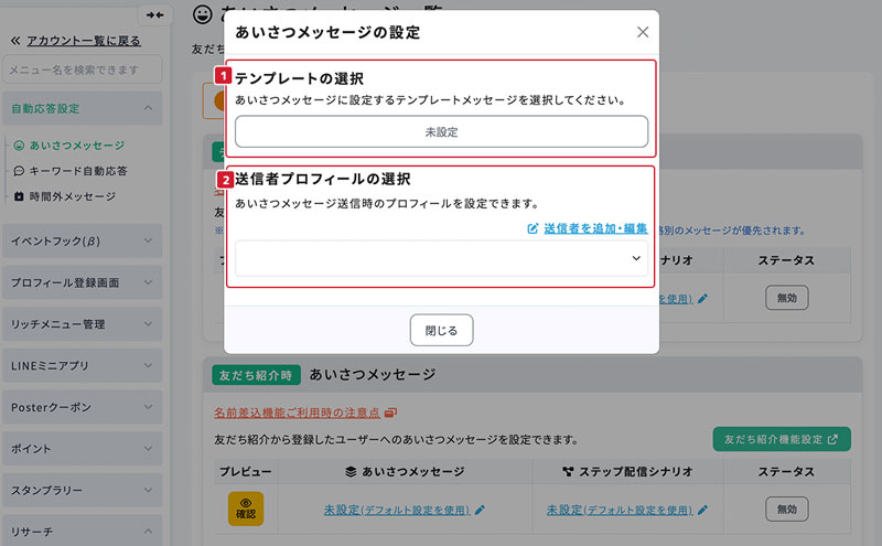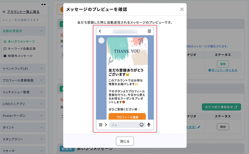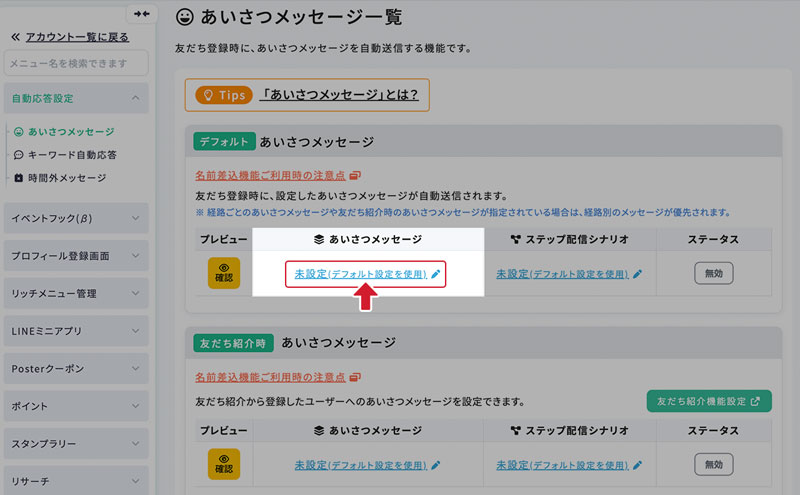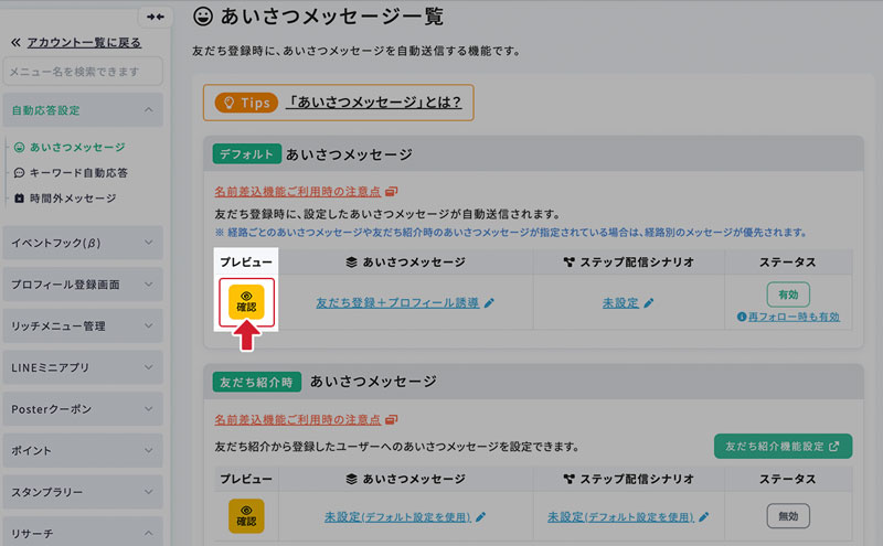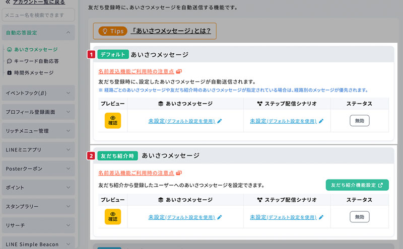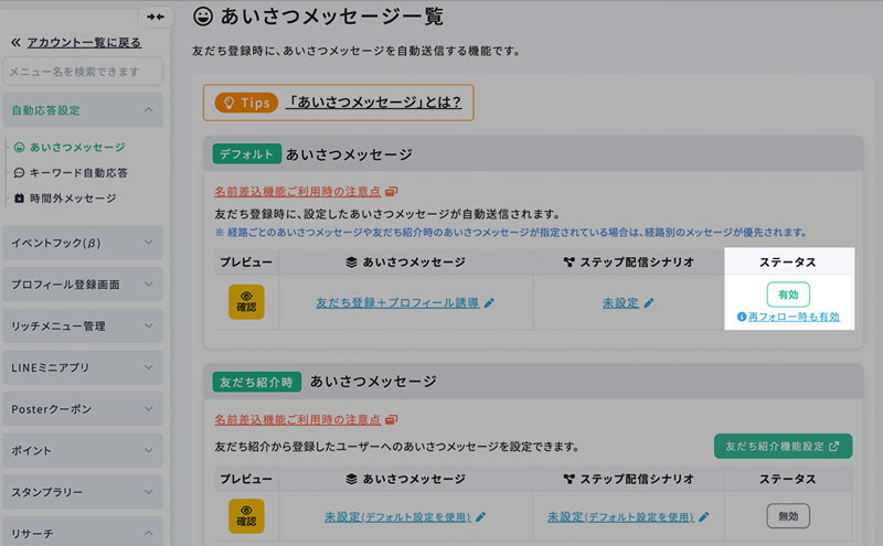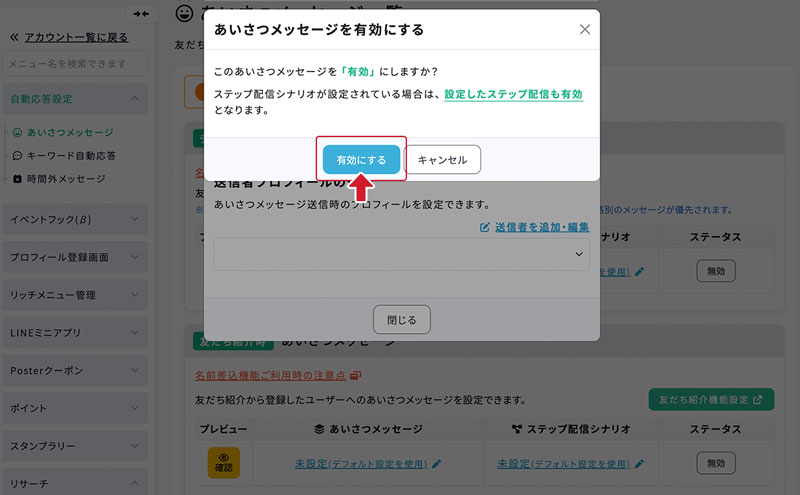 ※ あいさつメッセージにステップ配信シナリオを設定していた場合は、設定したステップ配信シナリオも有効になります。
