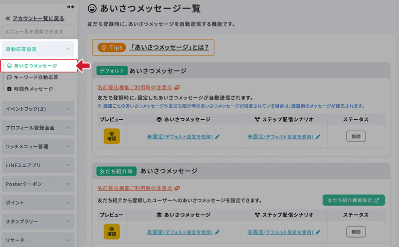 サイドメニューから「自動応答設定 > あいさつメッセージ」を選択します。