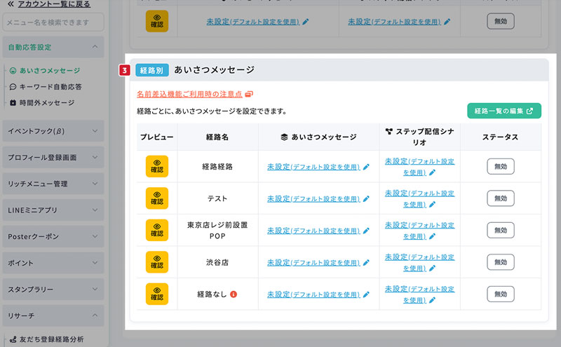 経路ごとにあいさつメッセージを設定する方法はこちら