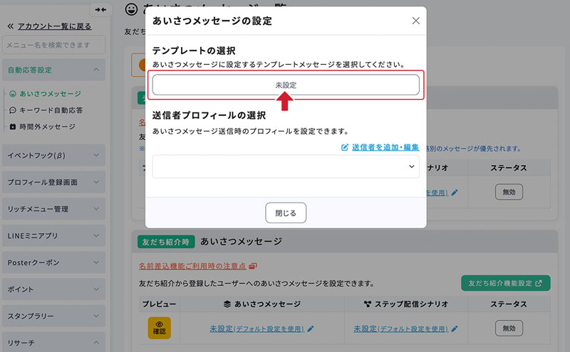 あいさつメッセージに設定するテンプレートを選択します。「未設定」をクリックします。