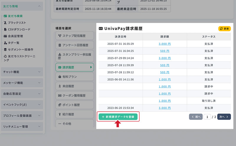 請求データを作成する場合は、左下にある新規請求データを登録をクリックします。