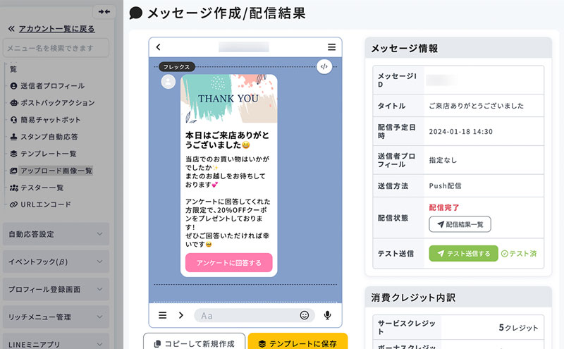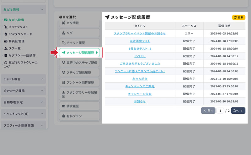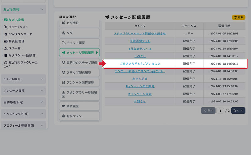 友だち詳細画面 − メッセージ送信履歴 最終更新日:2025年12月15日 メッセージ送信履歴 友だちに配信されたメッセージを、 友だち詳細画面のメニュー「メッセージ送信履歴」から確認できます。 1.メッセージタイトルを選択 配信されたメッセージを確認する場合は、一覧からメッセージタイトルをクリックします。 2.メッセージ詳細を確認 対象メッセージの詳細画面に移動します。