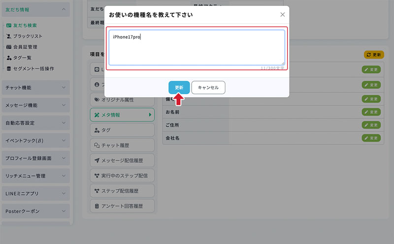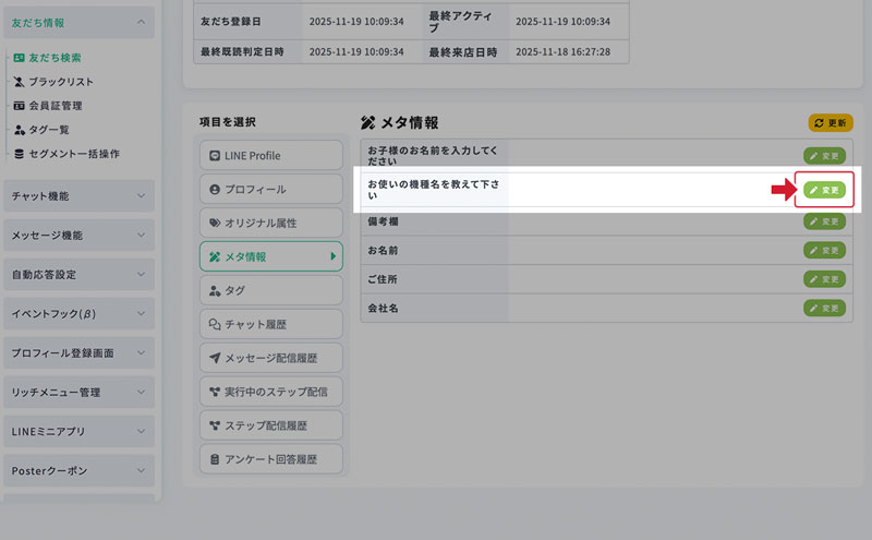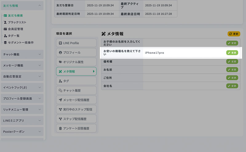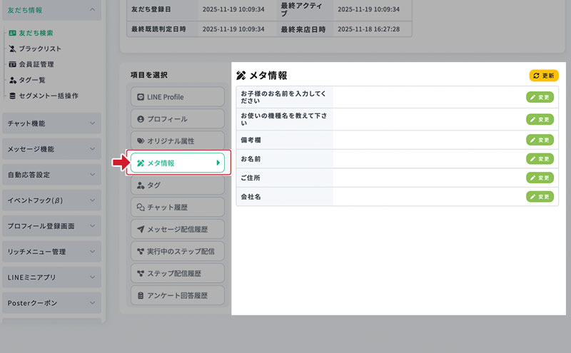 友だち詳細画面 − メタ情報 最終更新日:2025年12月15日 メタ情報 友だちが回答したメタ情報は、 友だち詳細画面のメニュー「メタ情報」から確認できます。 メタ情報の回答は、友だち詳細画面上から変更することも可能です。 1.メタ情報の回答変更 メタ情報の回答は、変更から任意の内容へ変更することが可能です。 2.回答を変更 回答を書き換え(または消去)できます。 3.変更を反映 この画面から変更した値は、プロフィール登録画面上にも反映されます。 そのため、このメタ情報をプロフィール登録画面上にも表示している場合にはユーザーにも変更が見えます。