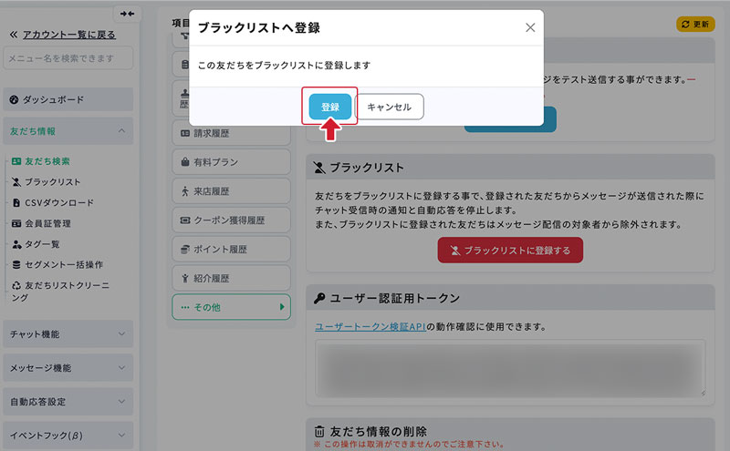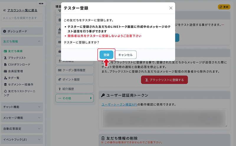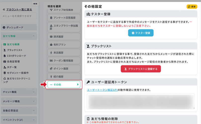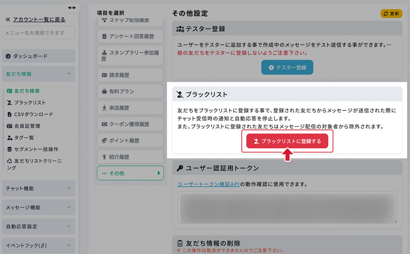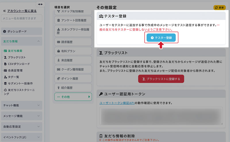 「テスター登録」「ブラックリスト登録」「友だち情報の削除」は