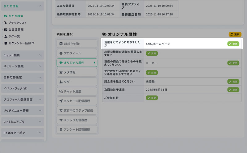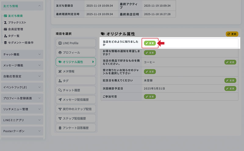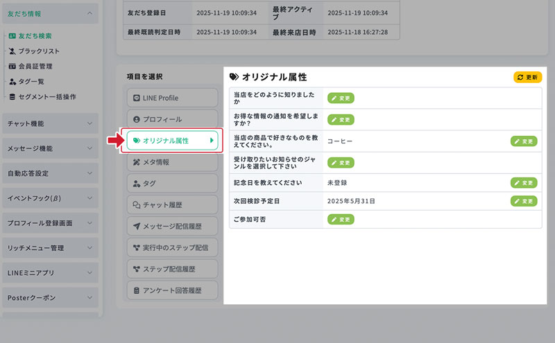 友だち詳細画面 − オリジナル属性 最終更新日:2025年12月15日 オリジナル属性 友だちが回答したオリジナル属性は、 友だち詳細画面のメニュー「オリジナル属性」から確認できます。 オリジナル属性の回答は、友だち詳細画面上から変更することも可能です。 1.オリジナル属性の回答変更 オリジナル属性の回答は、変更から任意のものへ変更することが可能です。 2.回答を変更 回答を変更、または未回答の状態へ変更できます。 3.変更を反映 この画面から変更した値は、プロフィール登録画面上にも反映されます。 そのため、このオリジナル属性をプロフィール登録画面上にも表示している場合にはユーザーにも変更が見えます。