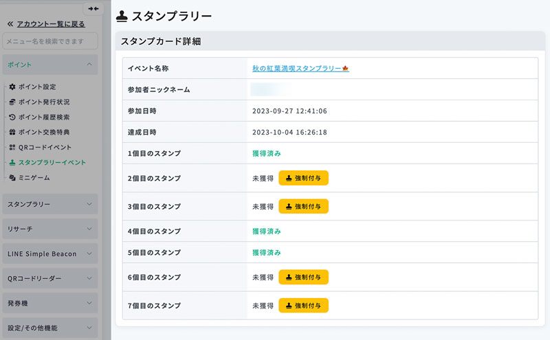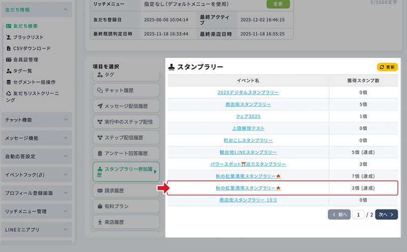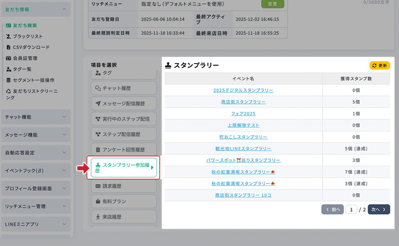 友だちのスタンプラリー参加履歴は、 友だち詳細画面のメニュー「スタンプラリー参加履歴」から確認できます。