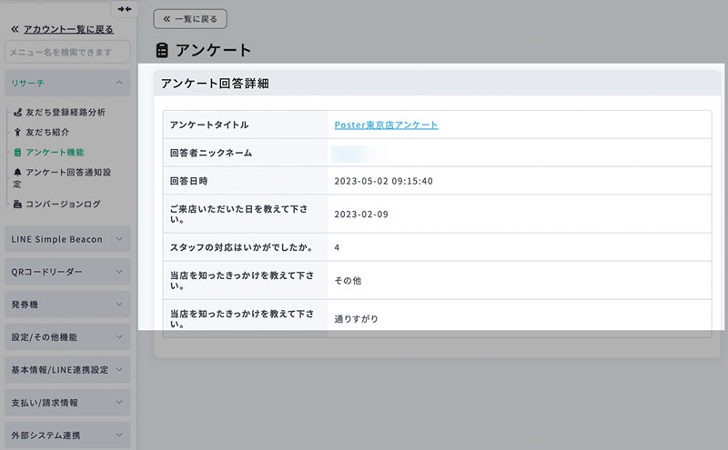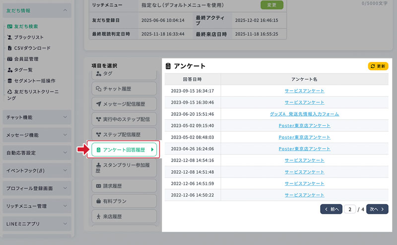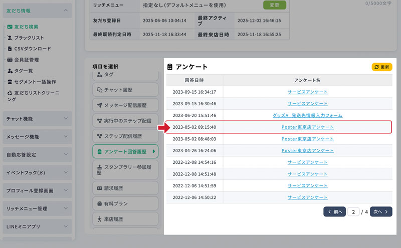 友だち詳細画面 − アンケート回答履歴 最終更新日:2025年12月15日 アンケート回答履歴 友だちのアンケート回答履歴は、 友だち詳細画面のメニュー「アンケート回答履歴」から確認できます。 1.確認したいアンケート名を選択 アンケートの回答内容を確認したい場合は、一覧から確認したいアンケート名を選択します。 2.アンケート回答詳細 このユーザーのアンケートの回答詳細データを確認できます。