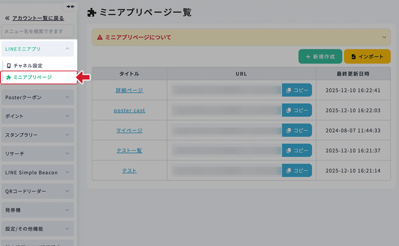 サイドメニューから「LINEミニアプリ > ミニアプリページ」を選択します。