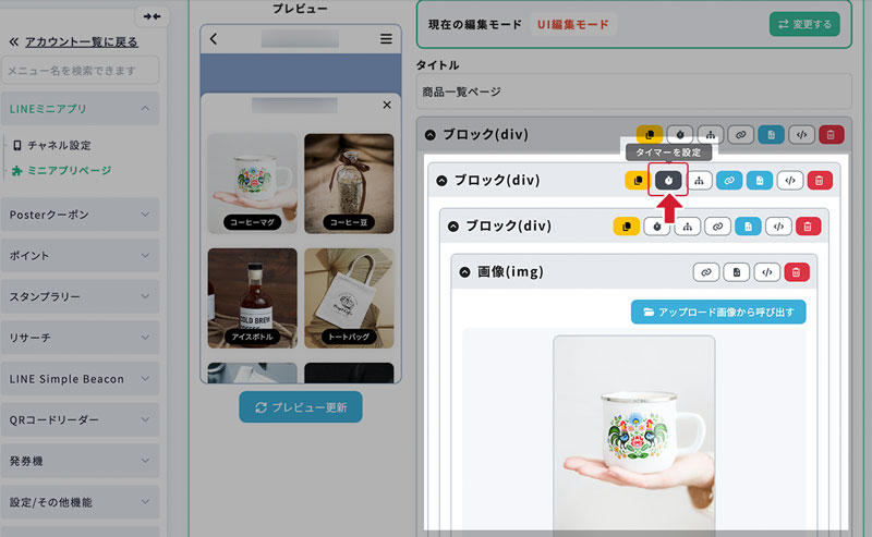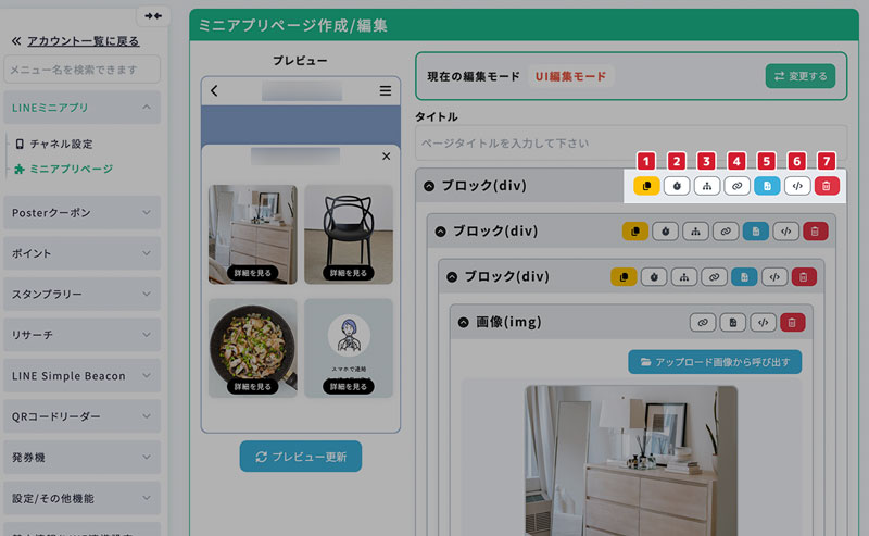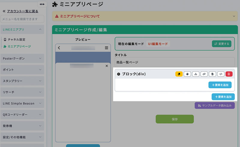 ミニアプリページの編集モードが表示されます。初期値は「UI編集モード」で、「JSONモード」に変更してJSONで直接記述することもできます。