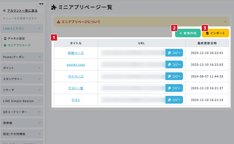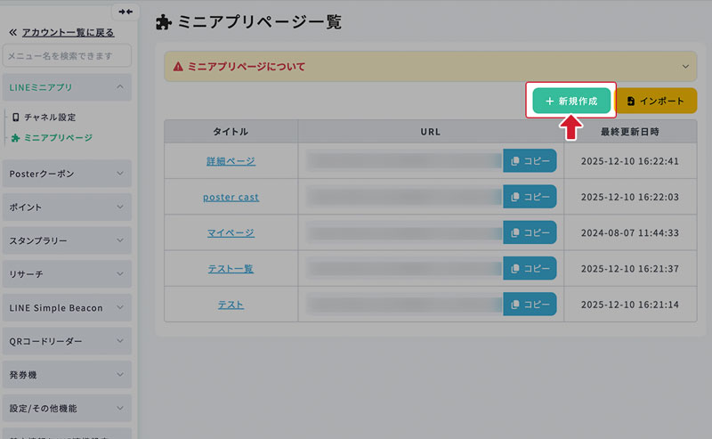 作成済みのミニアプリページの一覧が表示されます。