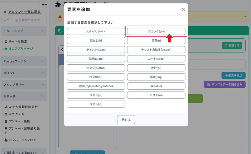 要素を選択します。この例では「ブロック(div)」を選択します。