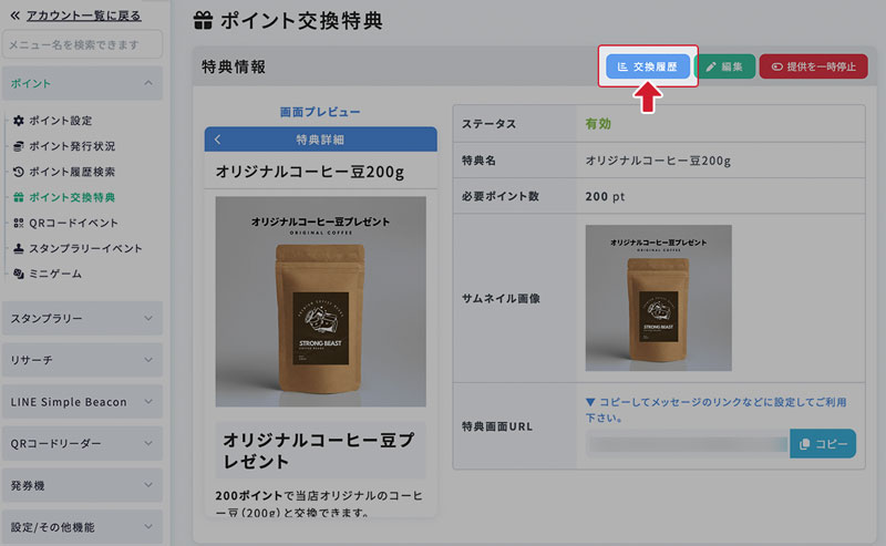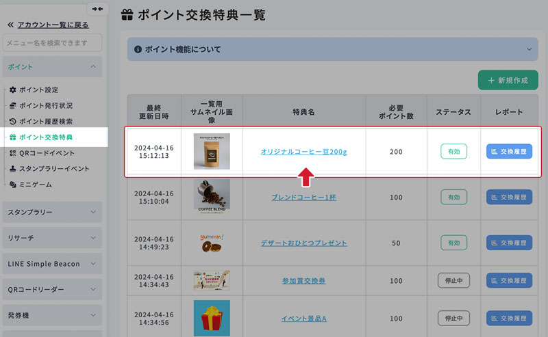 交換履歴画面では、対象の特典を交換したユーザーの一覧が表示されます。