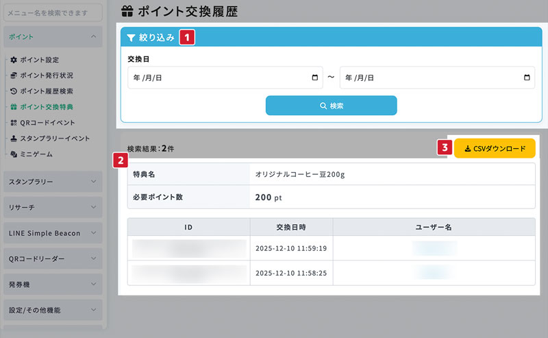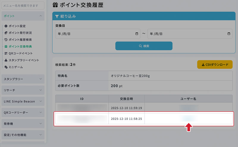 特典を交換したユーザーの一覧をCSVダウンロードできます。