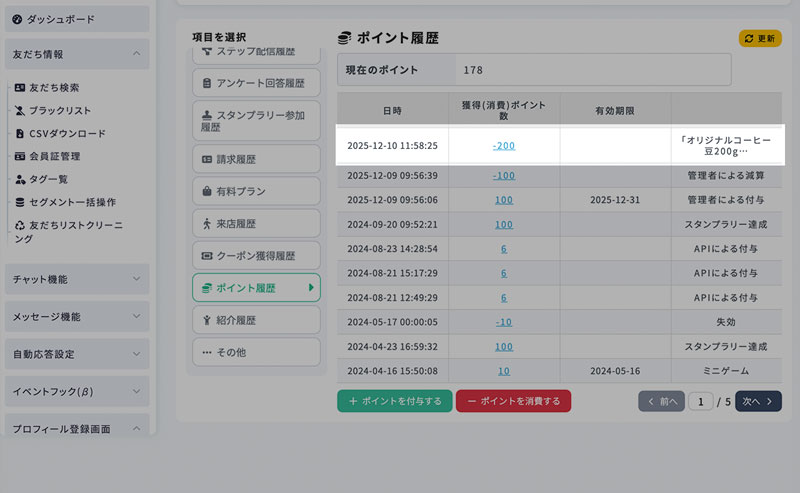 友だち詳細画面の「ポイント履歴」でユーザーが獲得/交換したポイント履歴が確認できます。